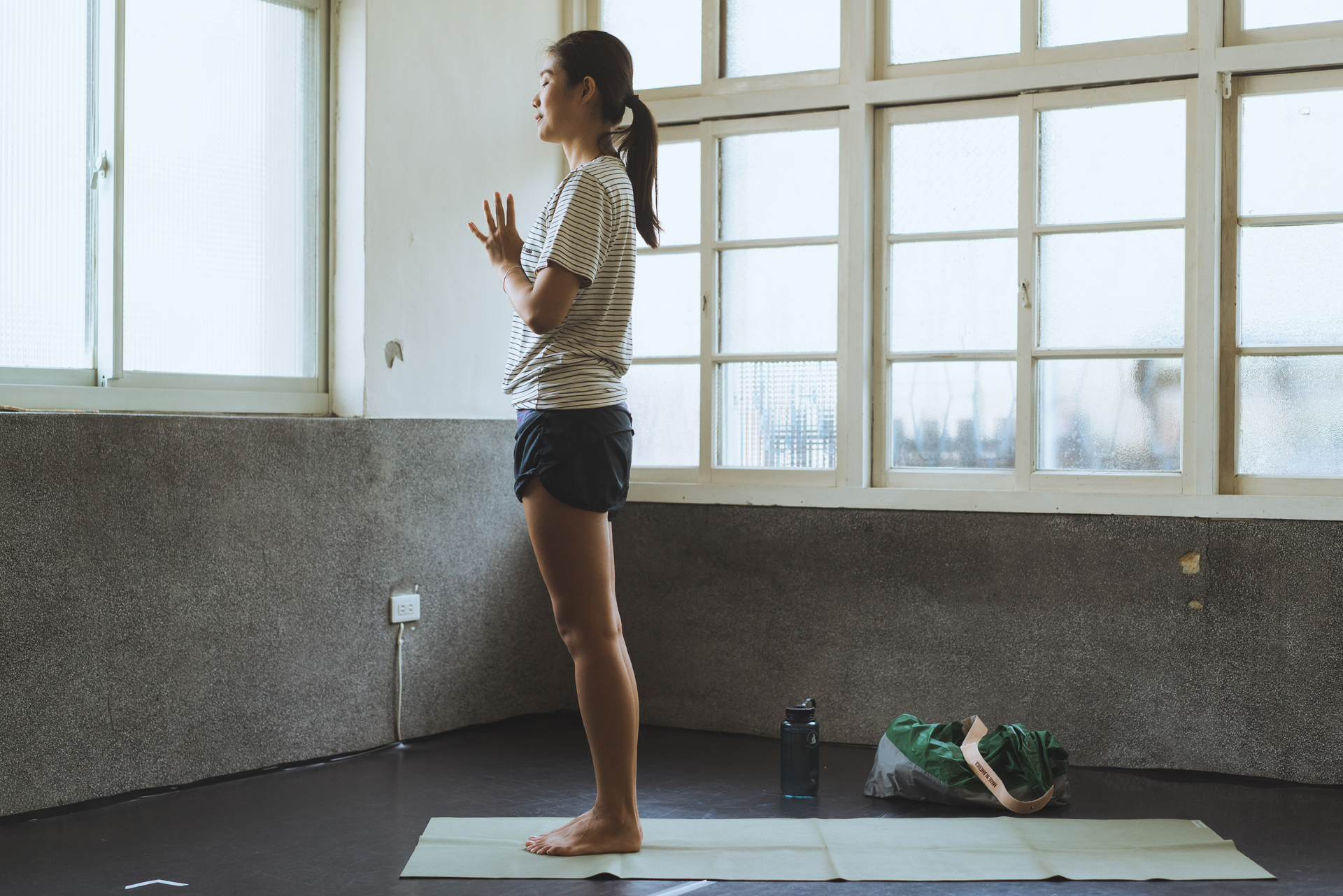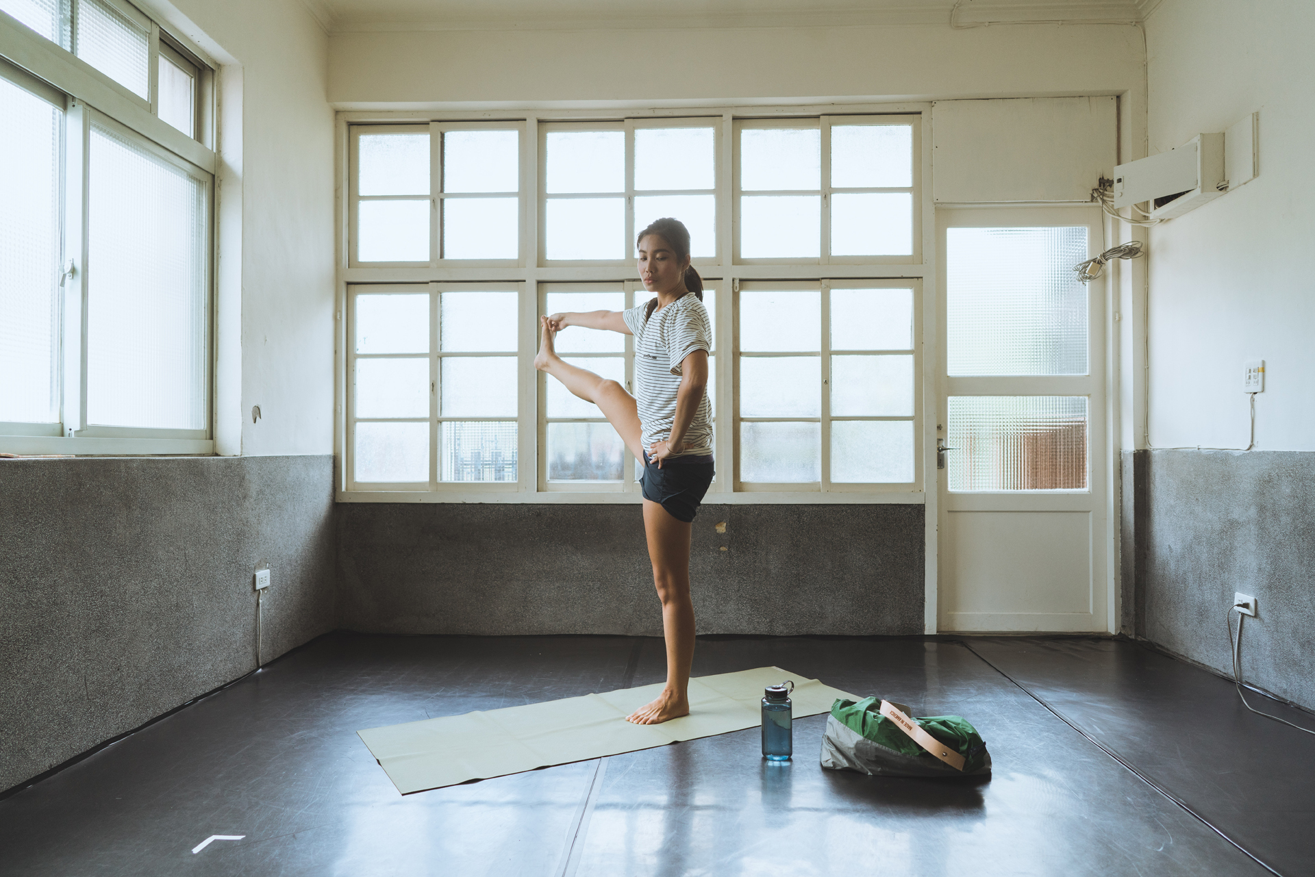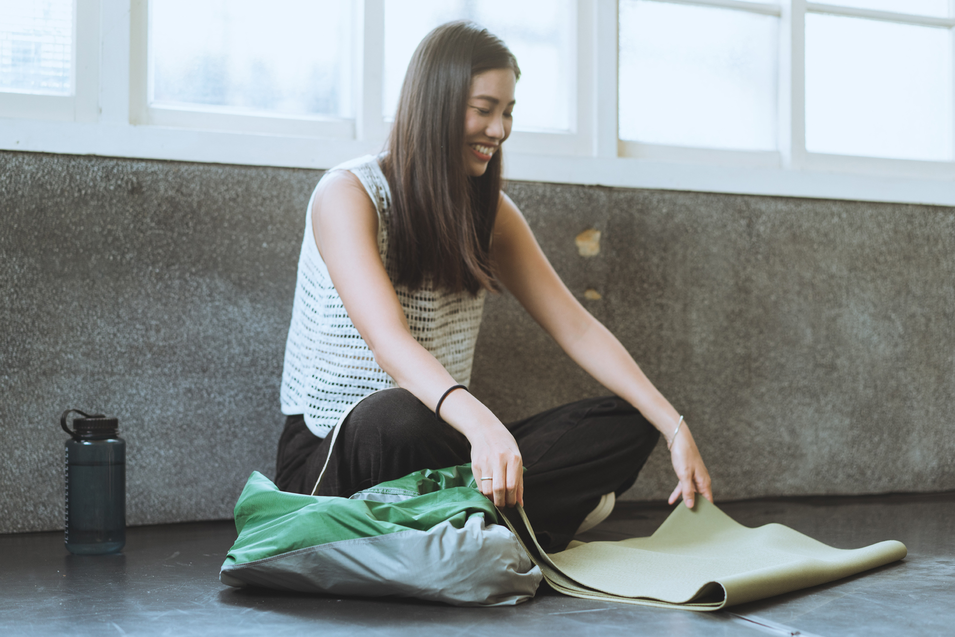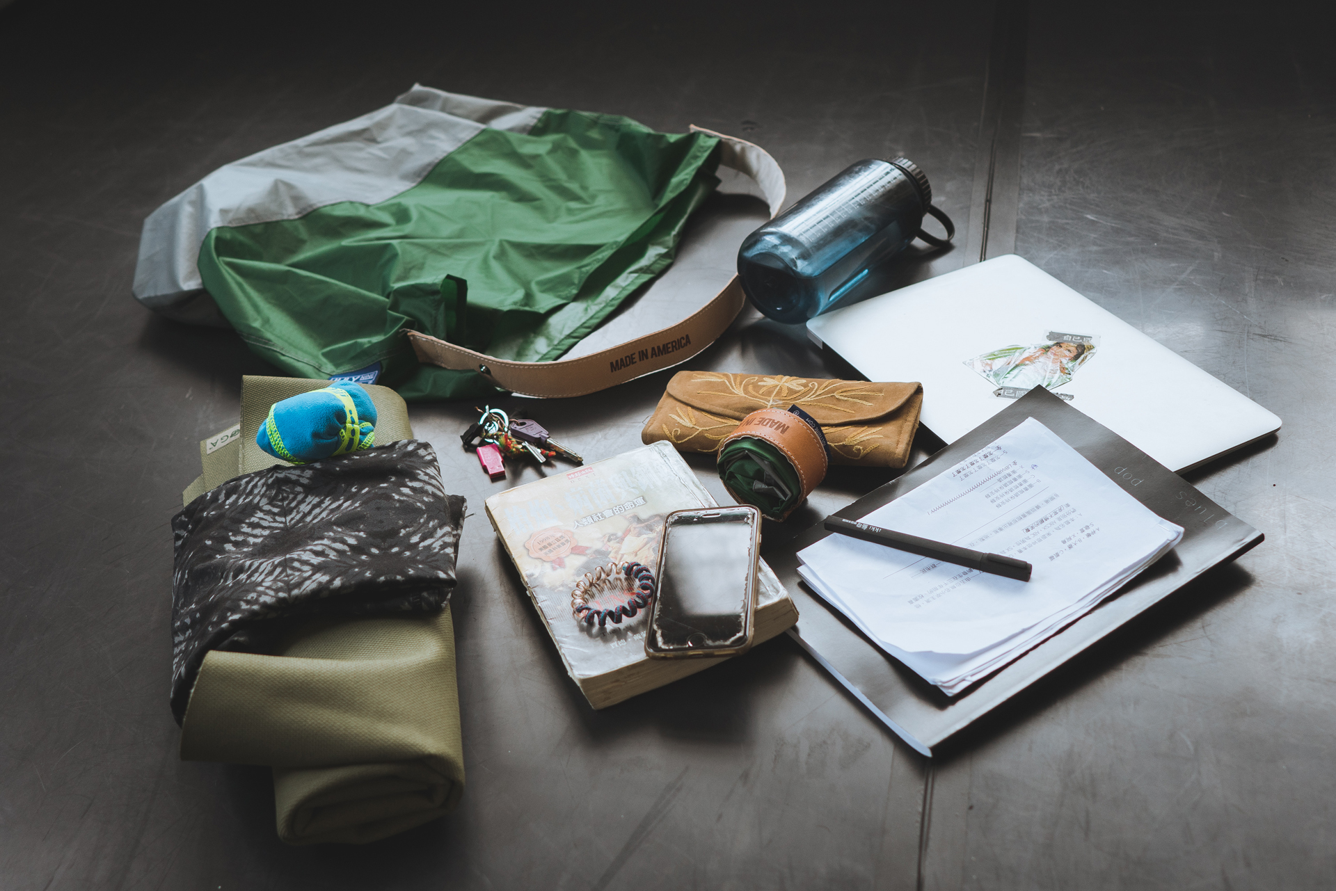 水壺、毛巾、July Nine購物袋、瑜珈服、筆袋、手機、鑰匙、錢包、劇本、書、瑜珈墊