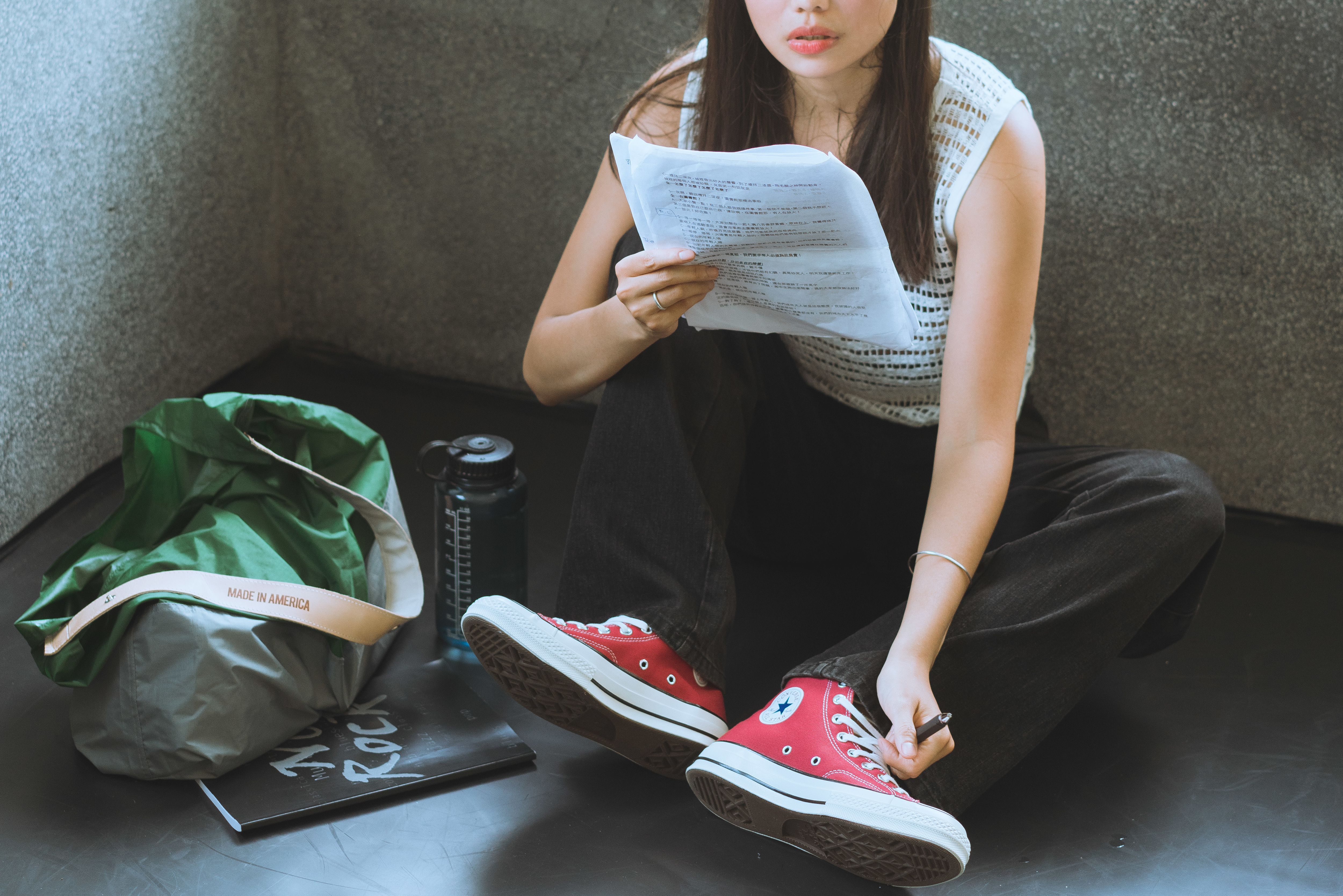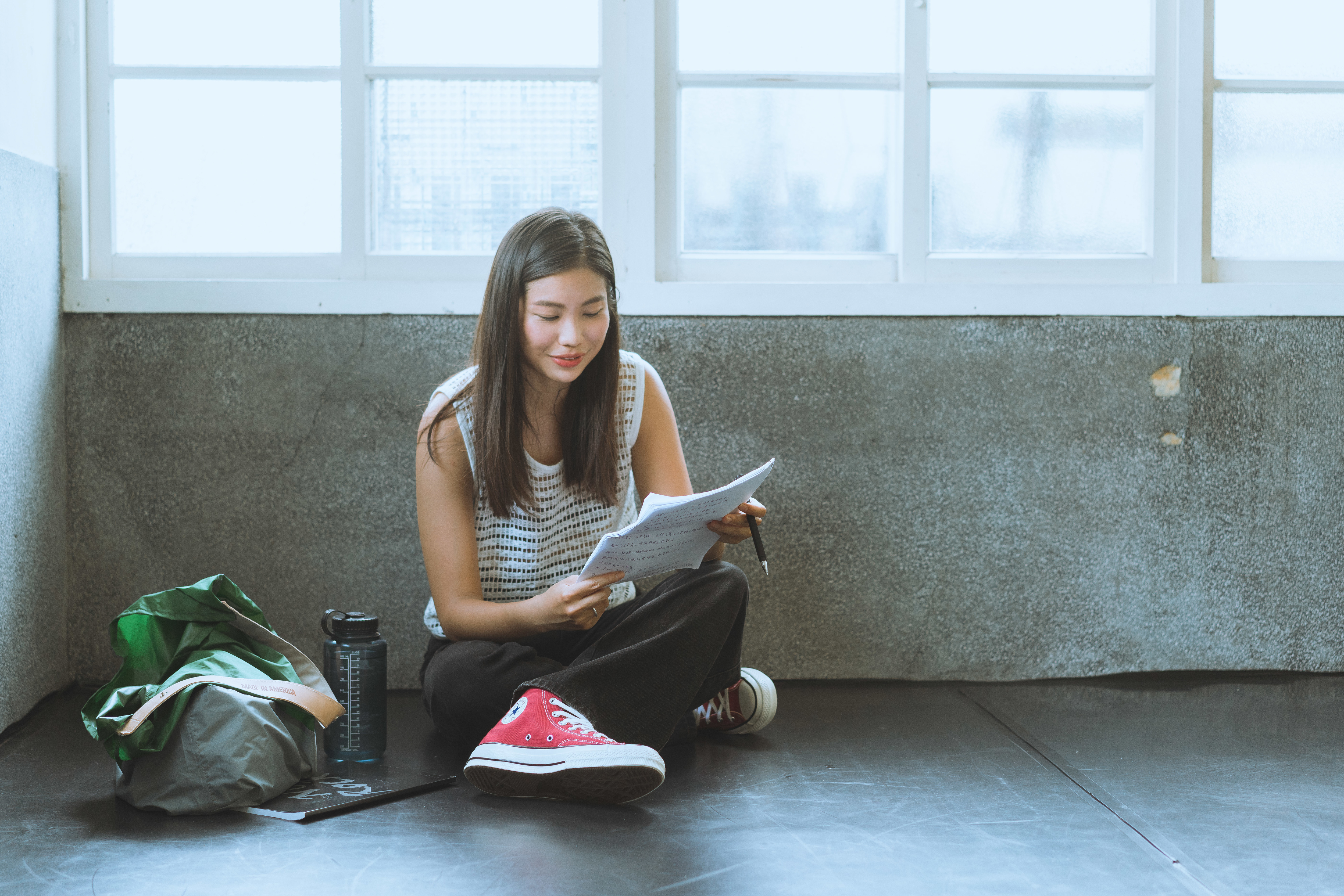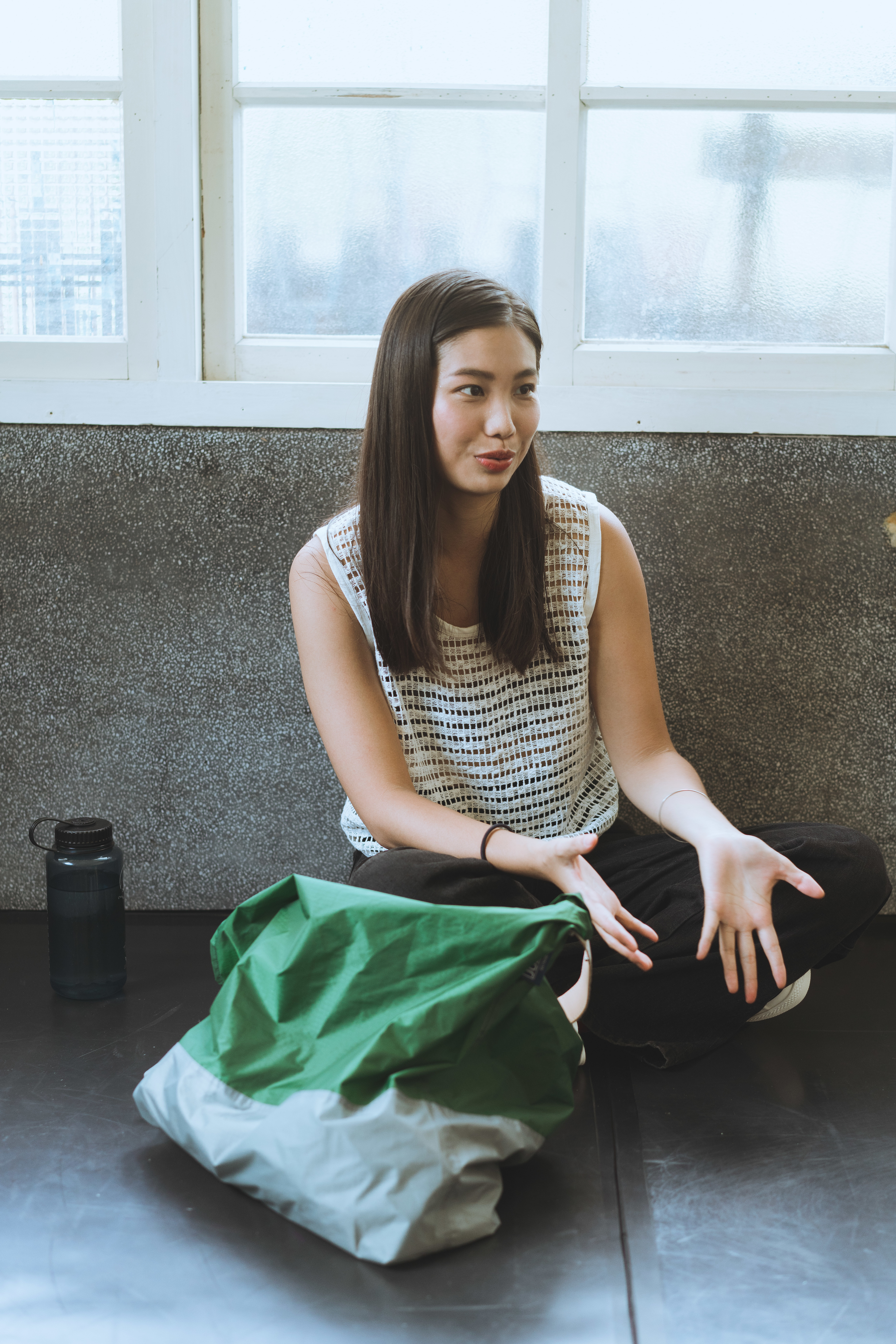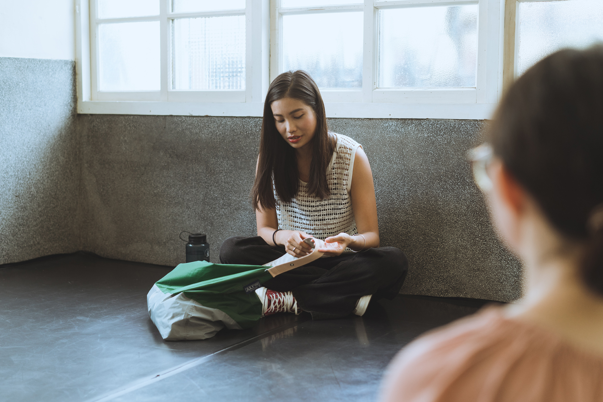水壺、毛巾、July Nine購物袋、瑜珈服、筆袋、手機、鑰匙、錢包、劇本、書、瑜珈墊