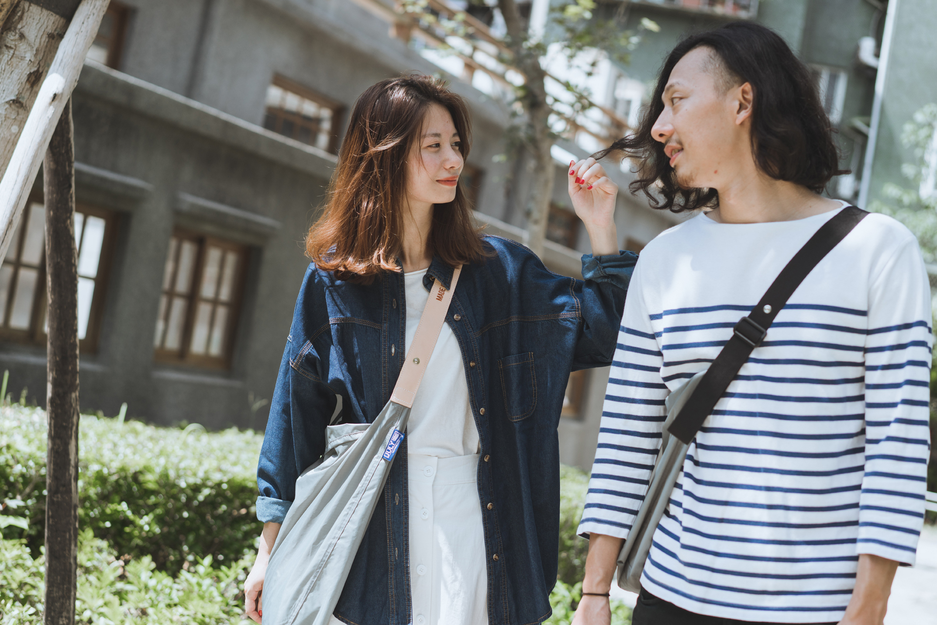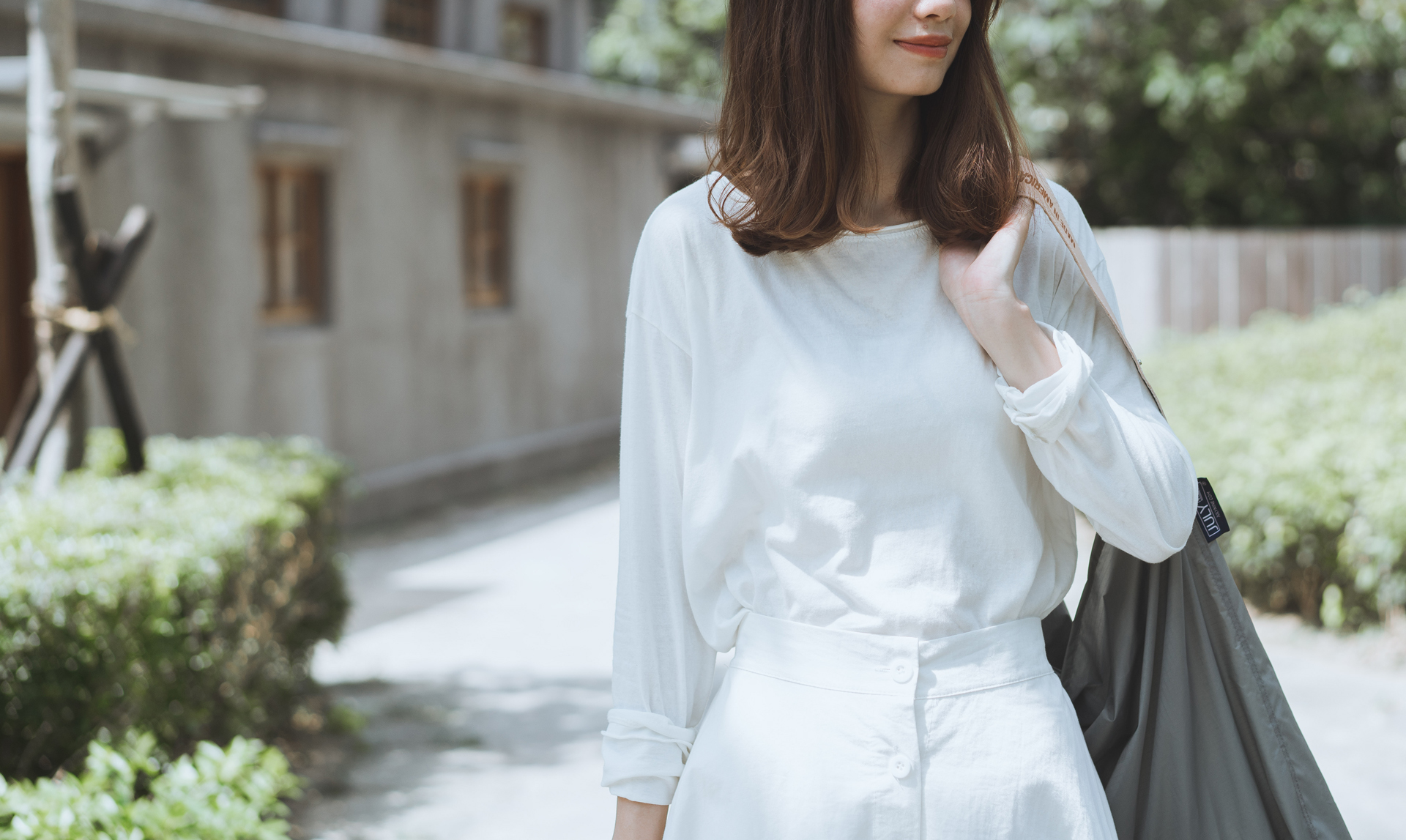 牛仔藍x純白的色塊搭配、不過度強調女性特質的版型,搭配 Julynine 24"的淺灰色大包;清爽卻又微妙的衝突感。