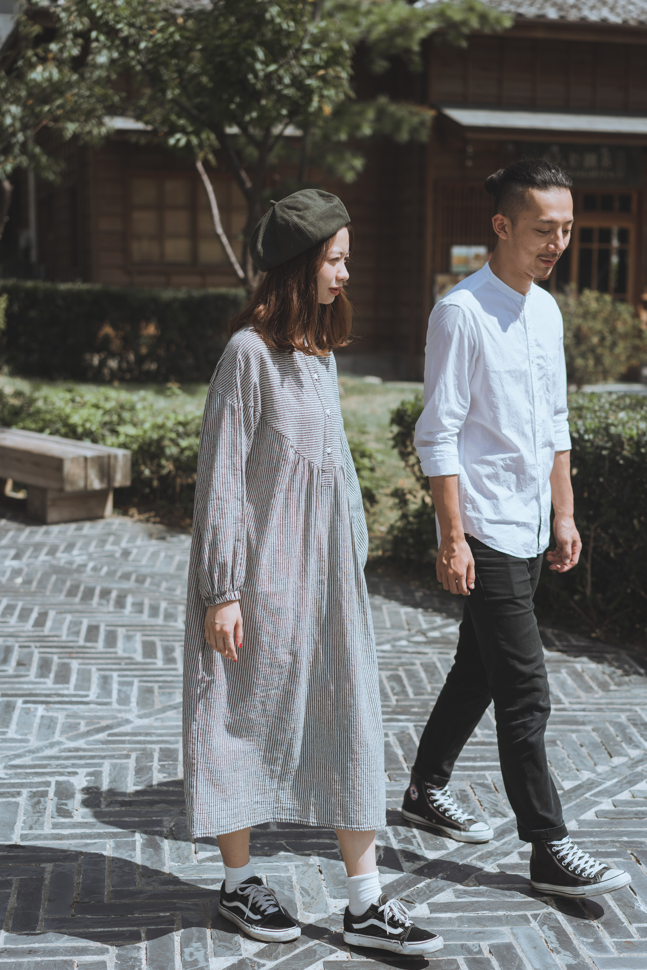 這件洋裝就是溫柔的具象。協調不過於搶眼的細條紋配色、袖口的縮口、充滿法式感的圓領開襟設計,使整體心曠神怡,同時帶點女性的柔美是這件洋裝最大的特色。隨手抓頂貝蕾帽來搭配,能讓造型更加完整。